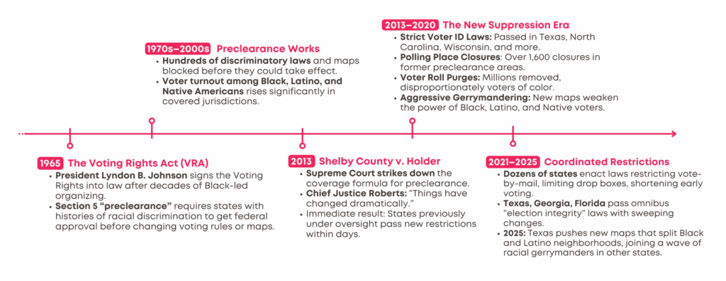 In 2013, the Supreme Court’s Shelby County v. Holder decision dismantled that shield. Without preclearance, the door reopened to the same discriminatory tactics the Act was written to stop. What followed was not slow erosion—it was an immediate flood of new restrictions.